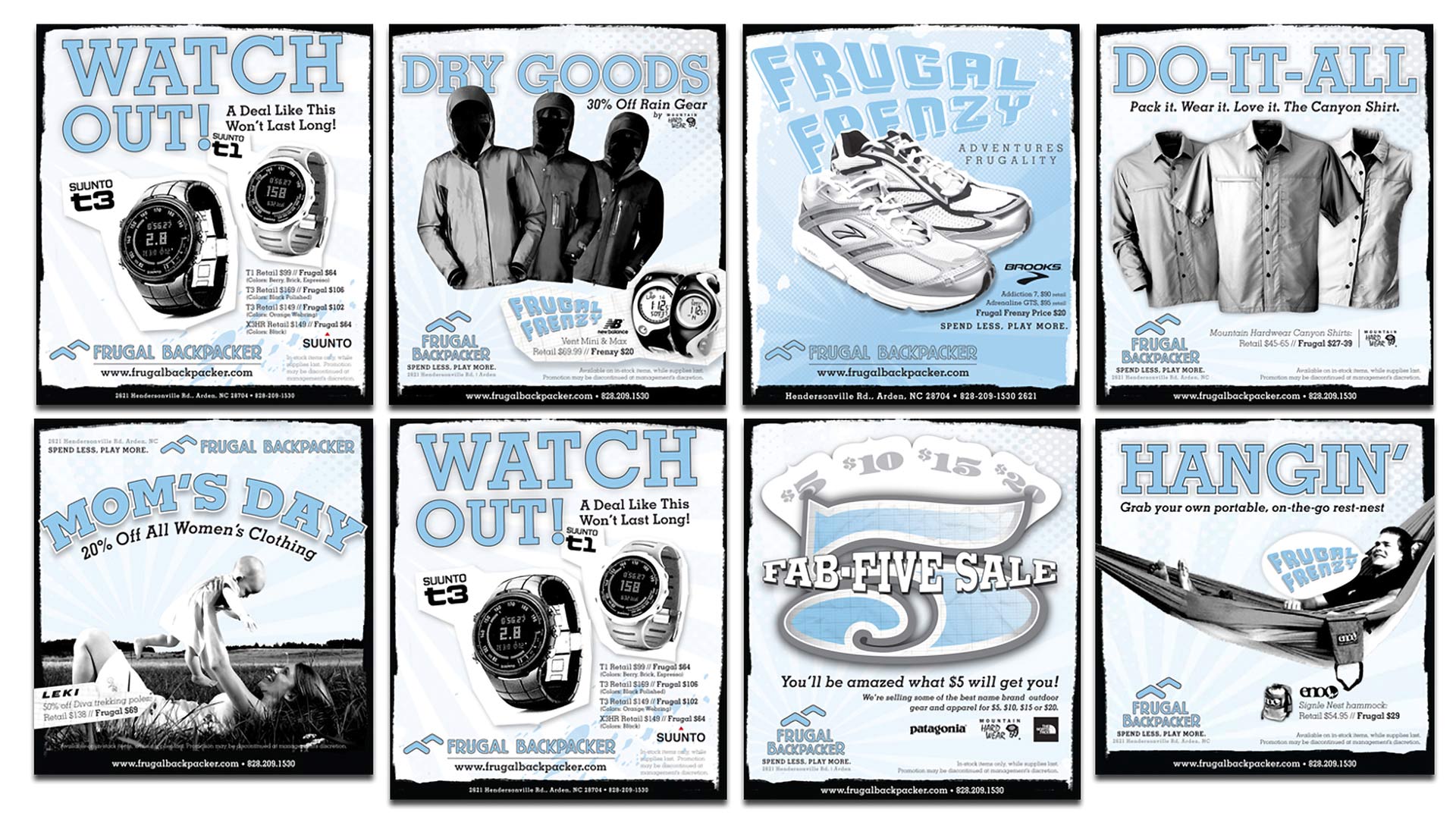 The concept of “frugality” informed every creative decision. Rather than glamorize the brand, we embraced a minimalist aesthetic—strategically limiting the color palette in all marketing materials to underscore our core value: delivering the best discounted outdoor products. Retaining the signature “Frugal” blue preserved brand equity, while pairing it with black-and-white imagery reinforced a value-driven, approachable identity perfectly aligned with our positioning.